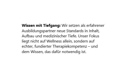 Du erhältst eine fundierte Ausbildung, die sowohl theoretische Grundlagen als auch praktische Erfahrung in den wichtigsten Bereichen der medizinischen und gewerblichen Massage umfasst. Unsere erfahrenen Referenten/-innen unterstützen dich in einer Atmosphäre, in der du dich nicht nur als Teilnehmer/in, sondern als Teil eines Teams fühlst.